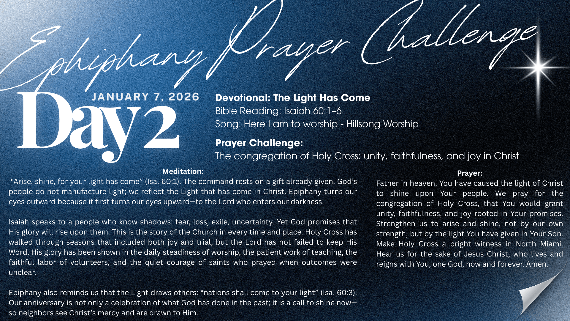 For 75 years, Holy Cross has shone in many ways: education, worship, care for families, neighbor love. The temptation is to grow comfortable and inward. Epiphany calls us outward: to shine intentionally, not to be applauded, but so God is glorified.
