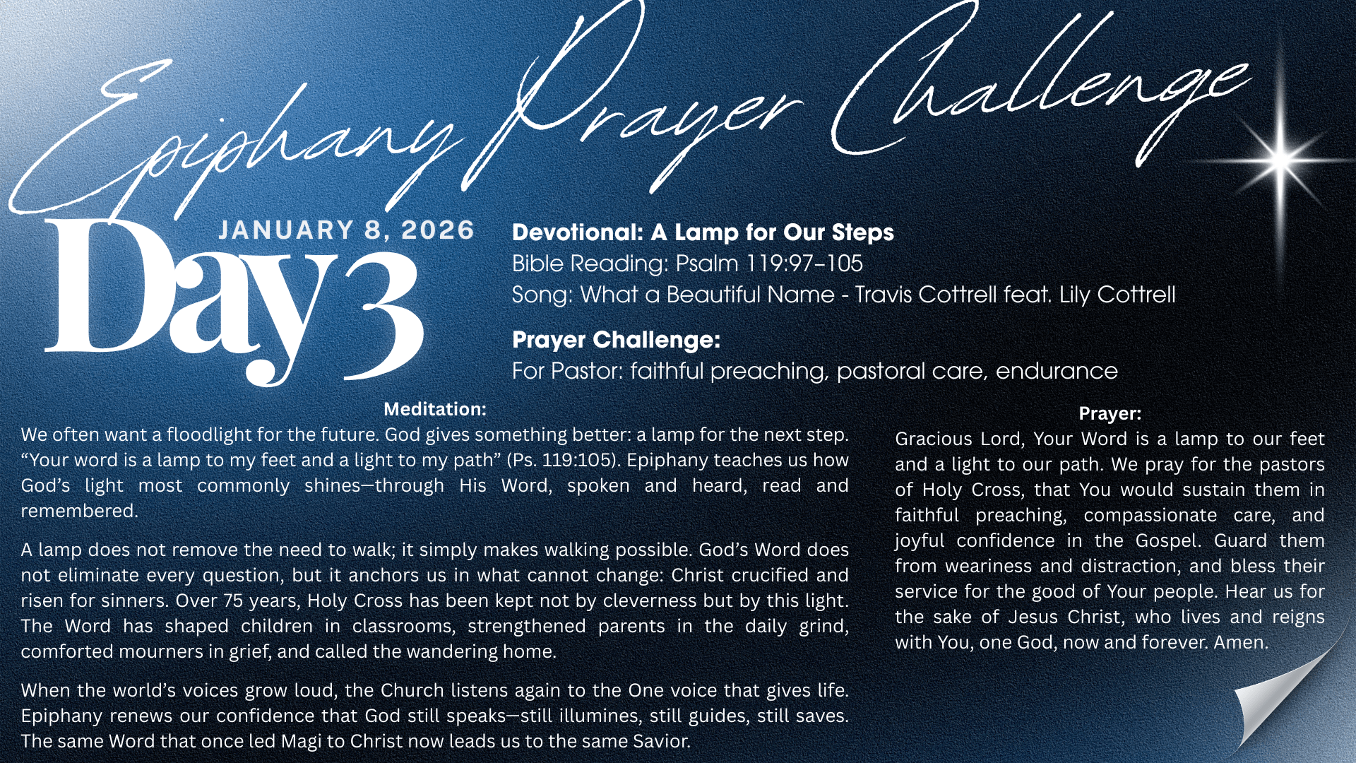 For seventy-five years, Holy Cross Lutheran Church and School has raised this joyful noise. Teachers have taught with faith. Students have learned with wonder. Families have been strengthened by the steady proclamation of Christ crucified and risen. Epiphany reminds us that this joyful witness shines outward—so the Kingdom of God may be heard, seen, and celebrated far beyond school walls.