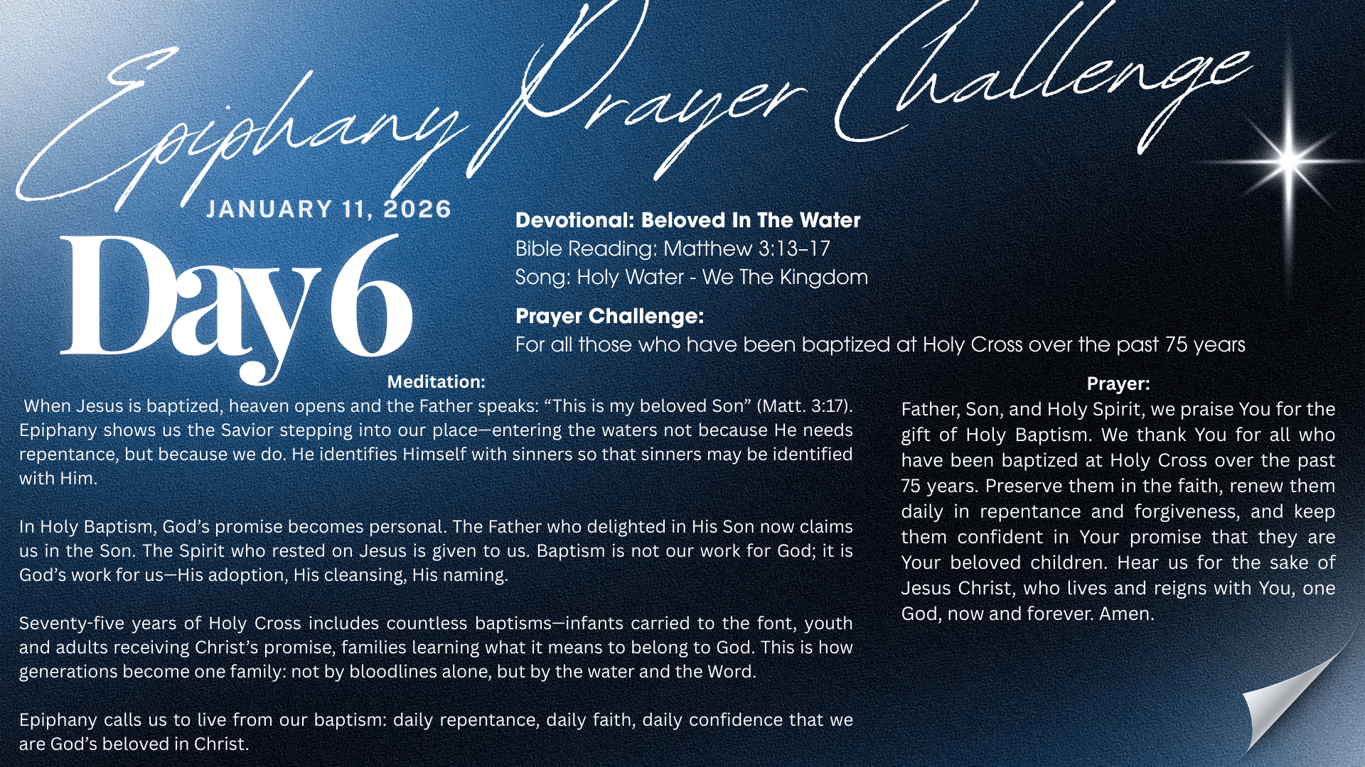 Holy Cross has sung this song for 75 years. Yet Epiphany invites renewal: Are we still telling? Still declaring? Still singing in ways that lift Christ high and welcome the seeking? The world does not need a church that blends in; it needs a church that clearly declares Jesus.