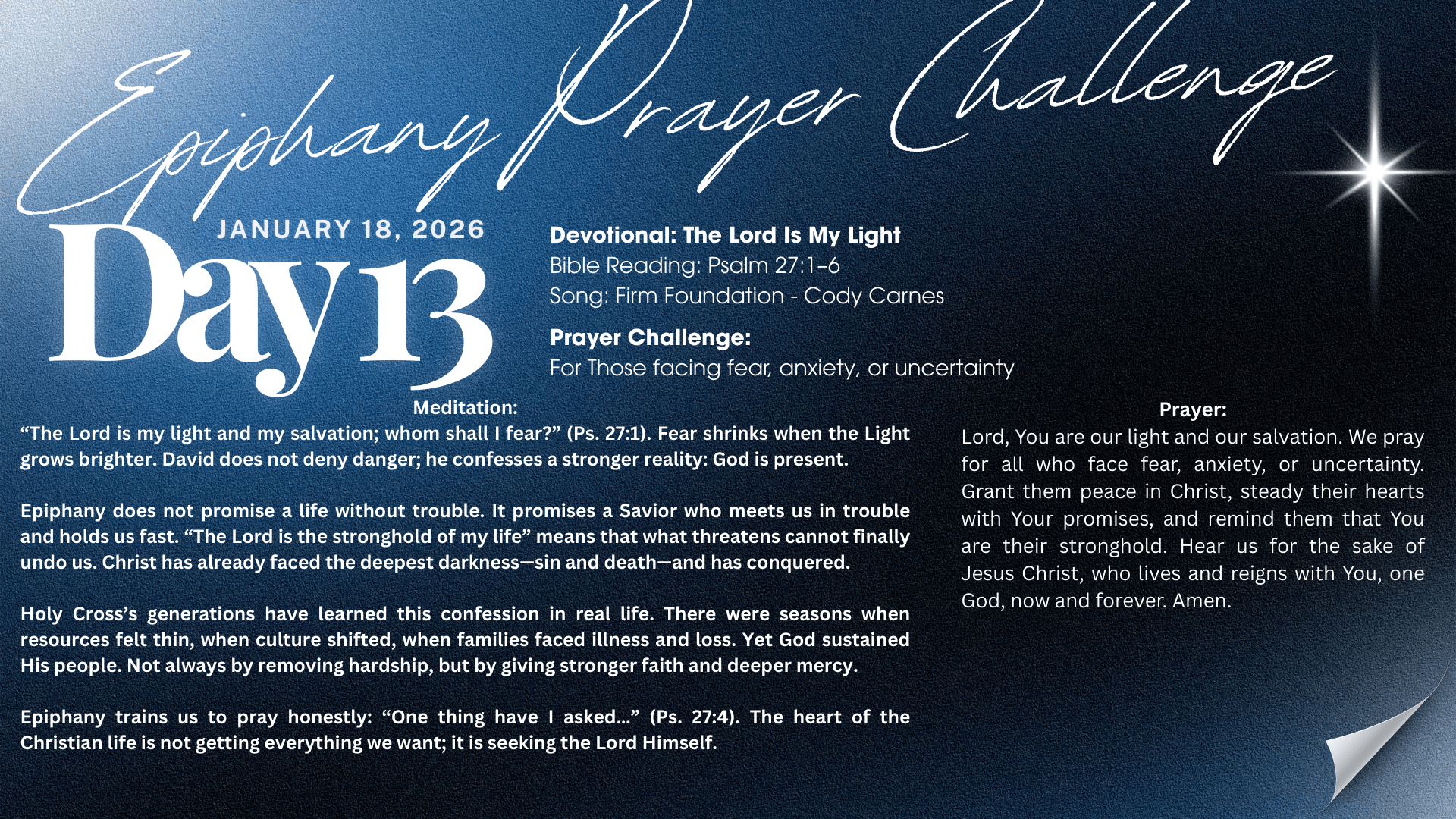 Lord, You are our light and our salvation. We pray for all who face fear,anxiety, or uncertainty. Grant them peace in Christ, steady their hearts withYour promises, and remind them that You are their stronghold. Hear us for thesake of Jesus Christ, who lives and reigns with You, one God, now and forever.Amen.