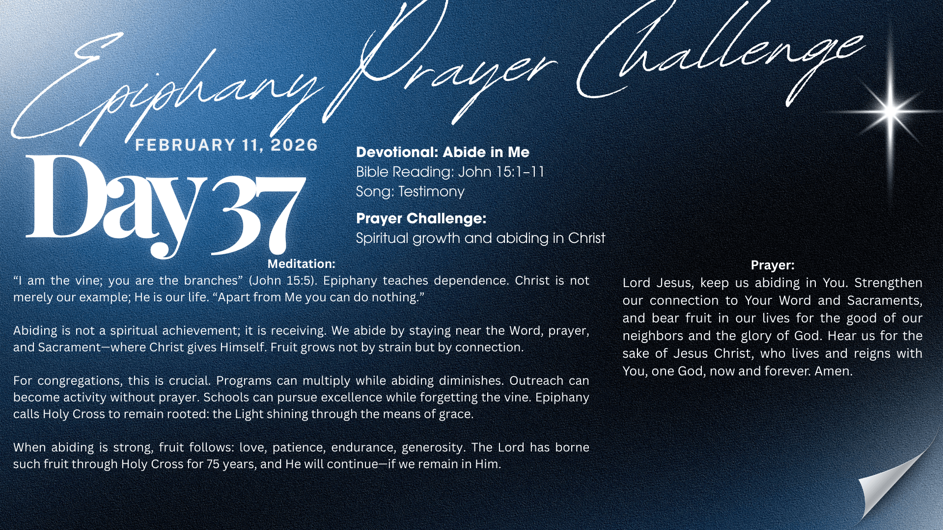 For congregations, this is crucial. Programs can multiplywhile abiding diminishes. Outreach can become activity without prayer. Schoolscan pursue excellence while forgetting the vine. Epiphany calls Holy Cross toremain rooted: the Light shining through the means of grace.